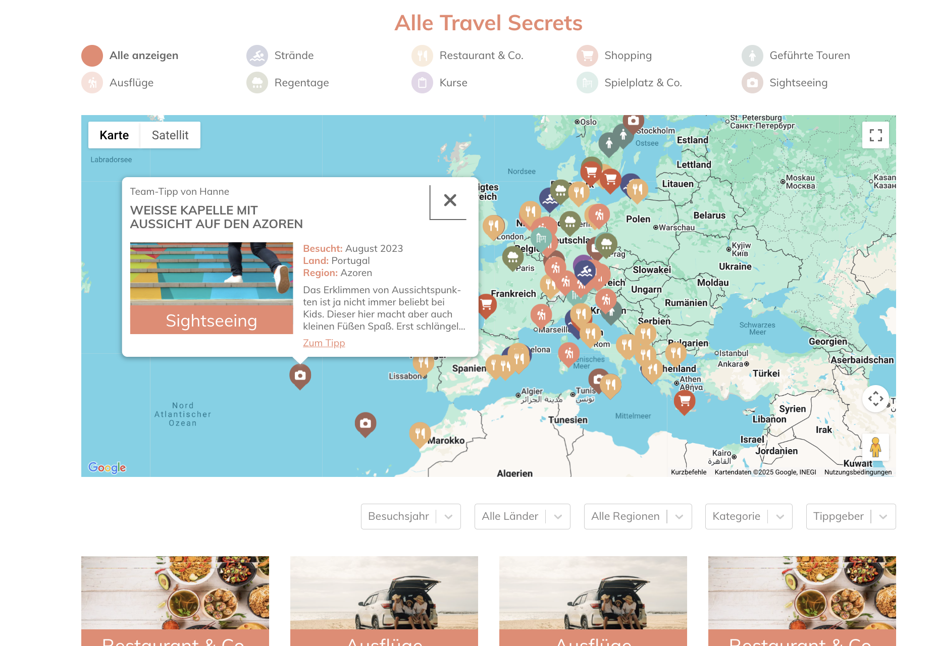 - auf einer interaktiven Weltkarte unsere Tipps für kinderfreundliche Restaurants, Strände, Wanderrouten, Ausflüge, Shopping & Co. durchstöbern – natürlich immer an den schönsten Locations rund um Eure Unterkünfte 😉
