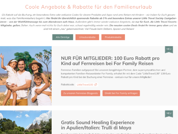Wollt Ihr Euch gleich noch beliebter machen in den Little Travel Secrets? Dann bietet doch einen exklusiven Rabatt oder ein Geschenk für unsere Mitglieder an! Euer Little Travel Secrets-Rabatt oder -Geschenk wird als “exklusiv für Mitglieder” gekennzeichnet. Zudem erscheinen alle neuen Rabatte oben in der Liste mit einem “Neu”-Fähnchen für mindestens einen Monat.